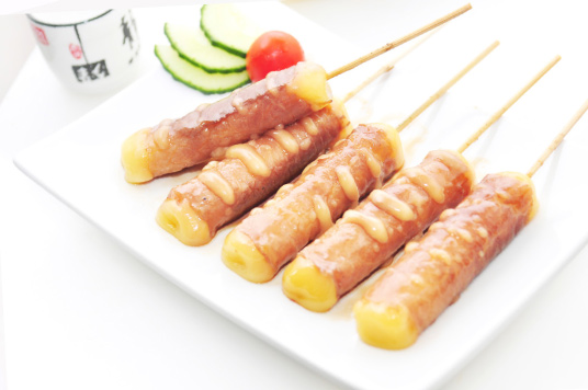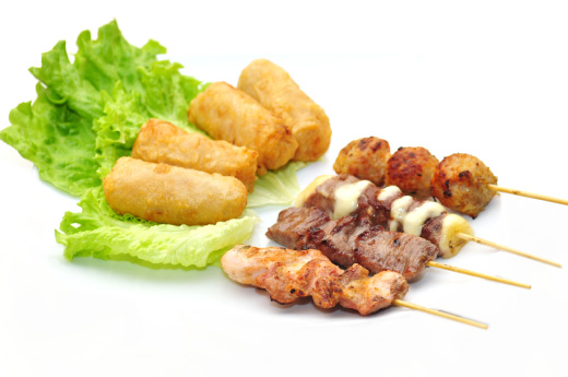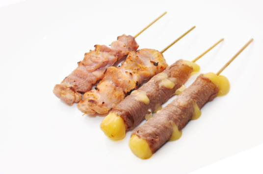oupe, Salade, Riz 6 Gyoza (poulet et légume) 4 brochettes : 1 poulet, 1 boeuf au fromage, 1 boeuf, 1 boulette de poulet