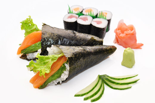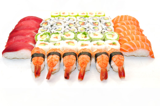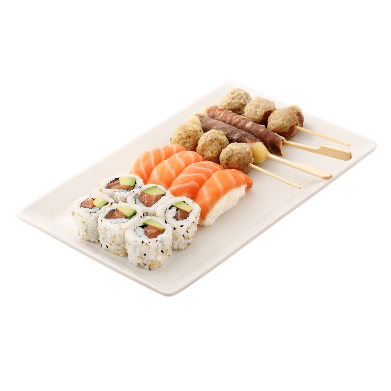 pour 2 pers 2 Soupes, 2 Salades, 2 Riz, 20 sashimi assortis, 4 sushi assortis, 6 maki california, 8 brochettes (2 saumon, 2 thon, 2 poulet, 2 boeuf au fromage)