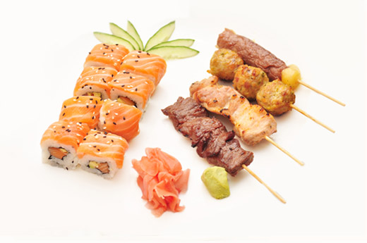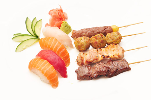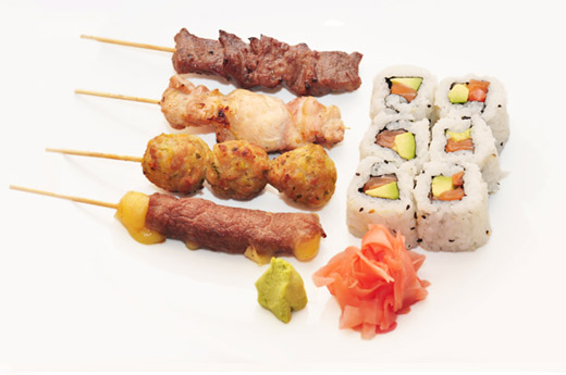 Soupe, Salade, Riz 4 Pièces de sushi assortis, 4 brochettes (1 poulet, 1 boulette de poulet, 1 boeuf, 1 boeuf au fromage)