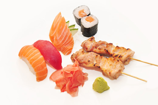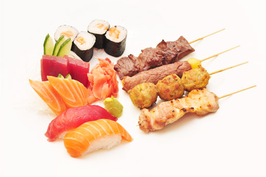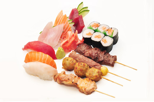 Soupe, Salade, Riz 2 Pièces de sushi, 4 Pièces de sashimi, 4 Pièces de maki, 4 brochettes (1 poulet, 1 boulette de poulet, 1 boeuf, 1 boeuf au fromage)