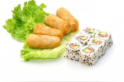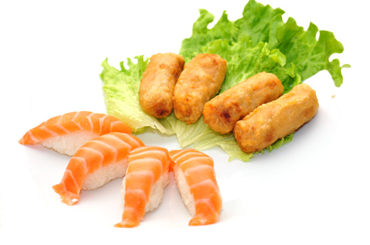 Soupe, salade, riz4 nêms au poulet9 sashimi saumon
