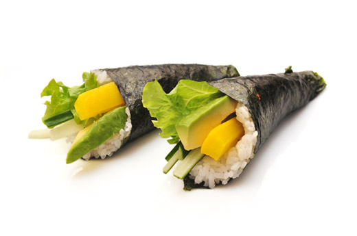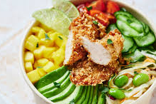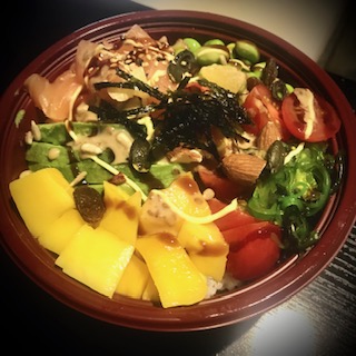 riz vinaigré,tempura poulet,avocat,salade d'algue,tomate cerise,haricot de soja,mangueselon la saison),sésame algue,sauce spécial