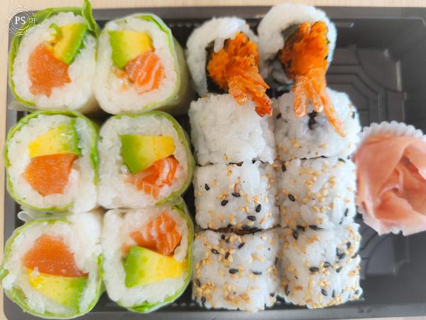 6 maki printemps saumon avocat 8 maki tempura crevette 1soupe 1salade choux
